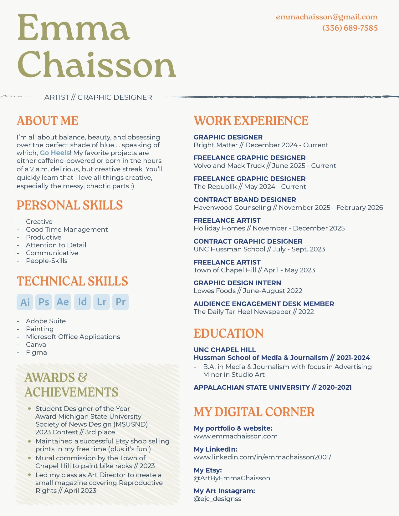 Since graduating, I’ve freelanced, contracted, and collaborated with all kinds of creatives, picking up new tricks (and a few bad habits) along the way. I’m happiest when I’m creating, unless Adobe crashes, in which case I’m yelling at my screen and threatening to quit forever (just kidding)!You can read all the boring details below…
